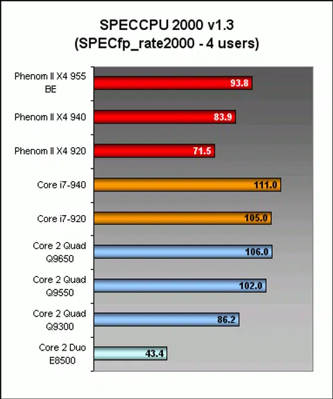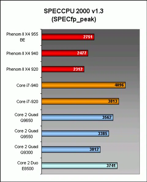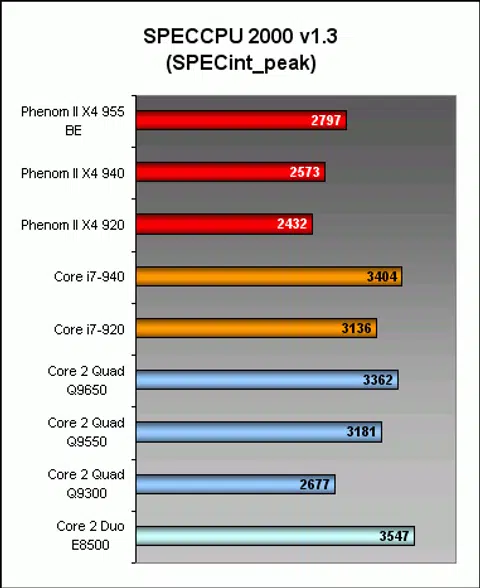 To get a good gauge of the processor's integer and floating-point performance prowess, our first order of testing began with SPEC CPU2000. The Phenom II processors manage this decently and far cry from original Phenom processors which we rather forget they ever existed. In the single-threaded peak speed tests, the new Phenom II X4 955 Black Edition CPU managed 9 to 11% performance increments over the Phenom II X4 940 running on the previous AM2+ platform. That's a nice speed bump. With regards to the competition, the Phenom II X4 955 was in close proximity of the Core i7-920 and that of the Core 2 Quad 9550 processors in the integer tests, but was bumped out of the same performance rank in the floating-point test.