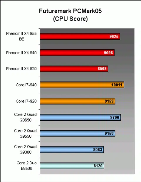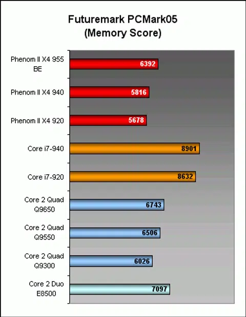 While the DDR3 equipped Phenom II X4 955 processor is still a long shot away from challenging the memory bandwidth of the Core i7 (most likely due to the latter's tri-channel implementation), it's great to note that it's giving Core 2 Quad processors a tough time. In fact, the Phenom II processors fared well in the raw CPU testing of the PCMark05 benchmark.