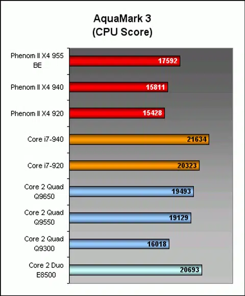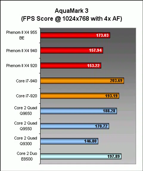 Using the old but reliable AquaMark engine for quick performance testing, we found that the Core i7 processors managed much better results just as expected customarily. However, the Phenom II X4 955 still managed equivalent performance standings when it came to the overall FPS score, which actually matters more.