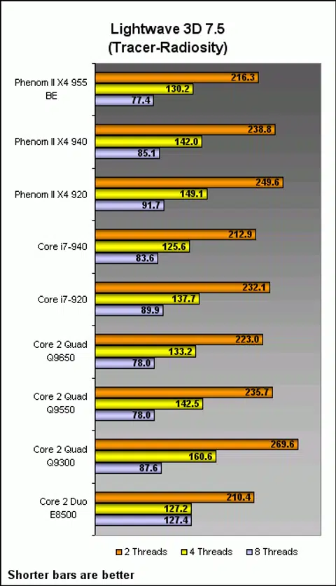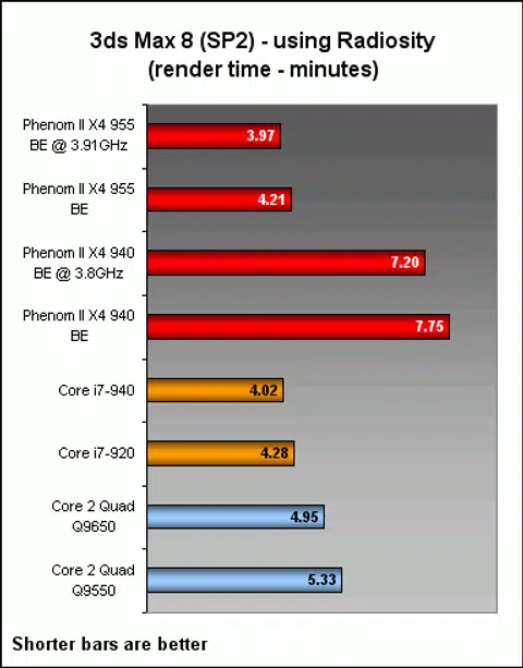 What surprised us more was of using the Radiosity lighting render option, which formerly gave the Phenom II processors (AM2+) nasty results but the Phenom II X4 955 on the new platform managed this workload with flying colors as it came out speedier than the Core 2 Quad processors and more crucially the Core i7-920 (which if you recall has the turbo option enabled).