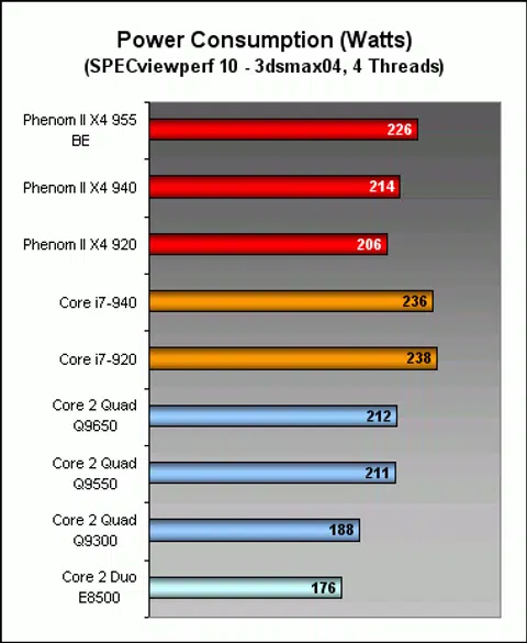 Compared with the Intel platforms, especially the Core 2 Quad 9550, the Phenom II X4 955 draws about 15% more power. But against the Core i7-920, the AMD system actually fares better. Though the Core i7-920 draws more power, it also performs better than the Phenom II X4 955 - in some scenarios. In other cases, the Phenom II X4 955 is able to rival the Core i7-920, so for the first time in a long while, AMD is able to deliver a decent CPU in both power and performance aspects.