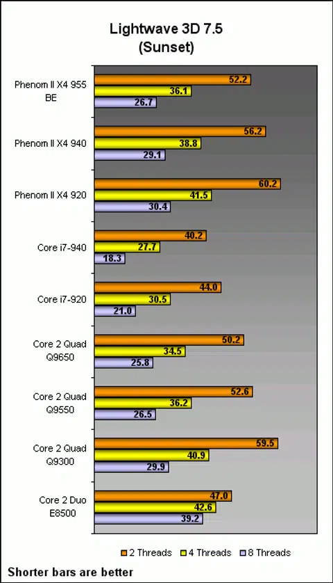 In our more taxing Tracer-Radiosity render test, the Phenom II X4 955 and even the 940 model were posing a serious challenge to both the Core 2 Quad 9550 and the entry-level Core i7-920 model. However on the swifter Sunset render test, the Core i7 still retained their crown. Still, the Phenom II X4 955 put up a decent showing as it managed to rival the more expensive Core 2 Quad 9550 in this test.