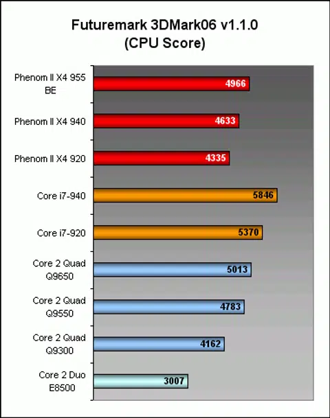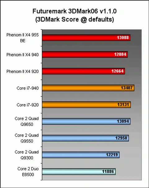 Gaming performance is one area that we've constantly criticized AMD for in the last couple of years. In the synthetic 3DMark06 testing, we the see the Phenom II X4 955 rivaling or leapfrogging the Core 2 Quad processor in both the CPU test and that of the overall performance 3Dmark score. The Core i7-920 still fared much better in the CPU test, but was however hardly much ahead in its overall 3Dmark score.