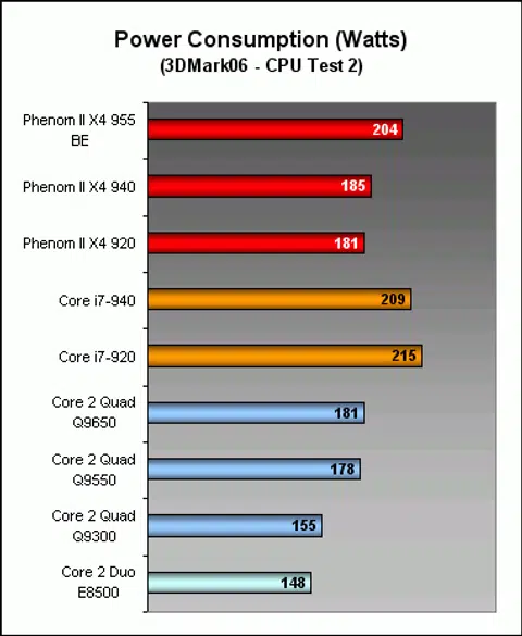Choosing the CPU-only test portion of the 3DMark06 benchmark to focus upon power consumption based on a mostly CPU-only load, the difference between Phenom II X4 955 Black Edition and Phenom II X4 940 seems to have a higher power draw difference than when comparing the 940 and 920 models. Do note though, the 955 processor using a newer AM3 platform whereas the other pair of processors are using the existing AM2+ platform and this only means that various platforms and motherboard implementations can have an affect on the power consumption of your system.