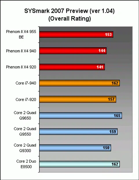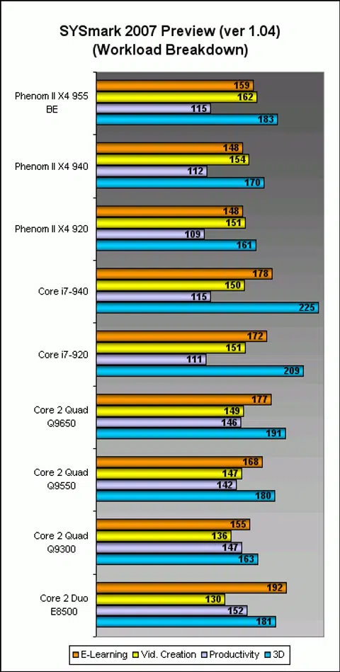 While SYSmark 2007 comprises of several test suites, it's interesting to note that the Phenom II X4 955 on the newer AM3 platform has managed an overall performance score that's just a couple of percentage points different from the Core i7-920.