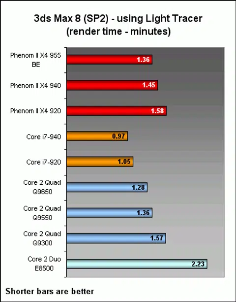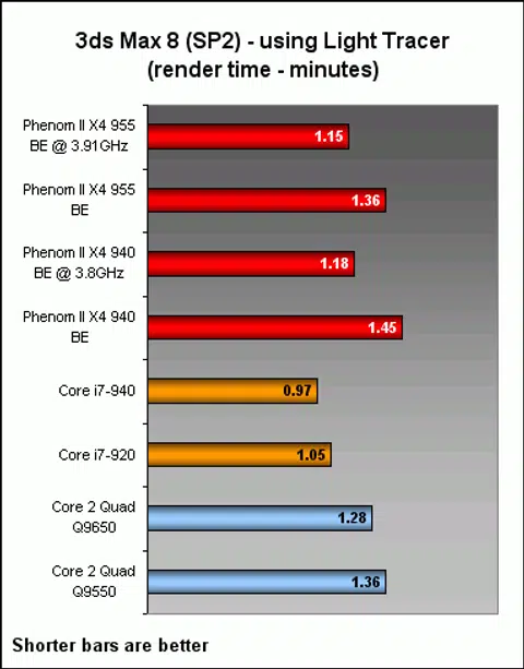 Using Autodesk's 3ds Max 8 rendering program, we ran the same test load by rendering it using Light Tracer and Radiosity advanced lighting options. On utilizing the Light Tracer rendering option, the Core i7-920 was still leading by quite a margin, but the Phenom II X4 955 scored the same result as the Core 2 Quad 9550.