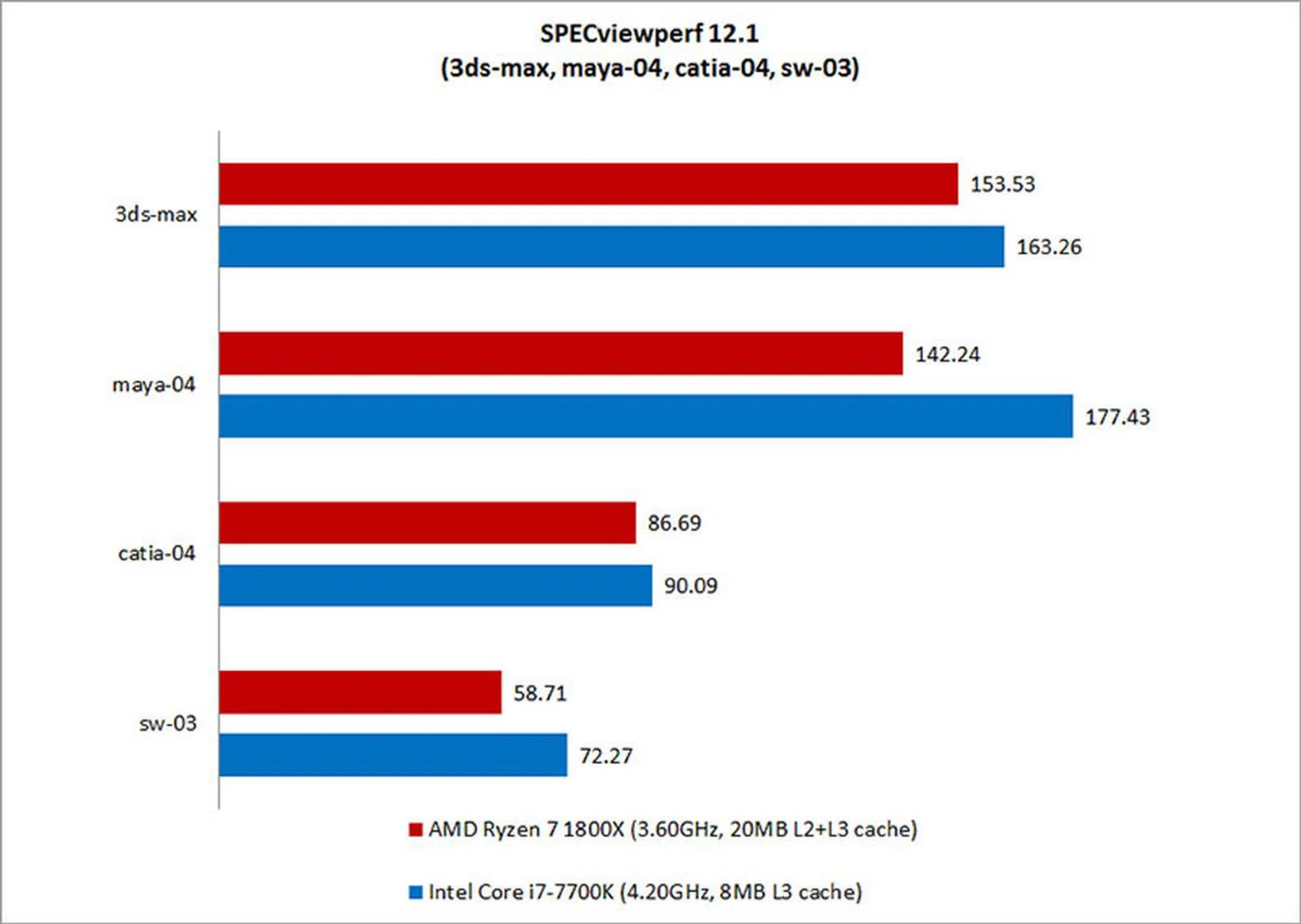 SPECviewperf 12.1 viewset / Processor models | AMD Ryzen 7 1800X | Intel Core i7-7700K | Intel Core i7-6950X |