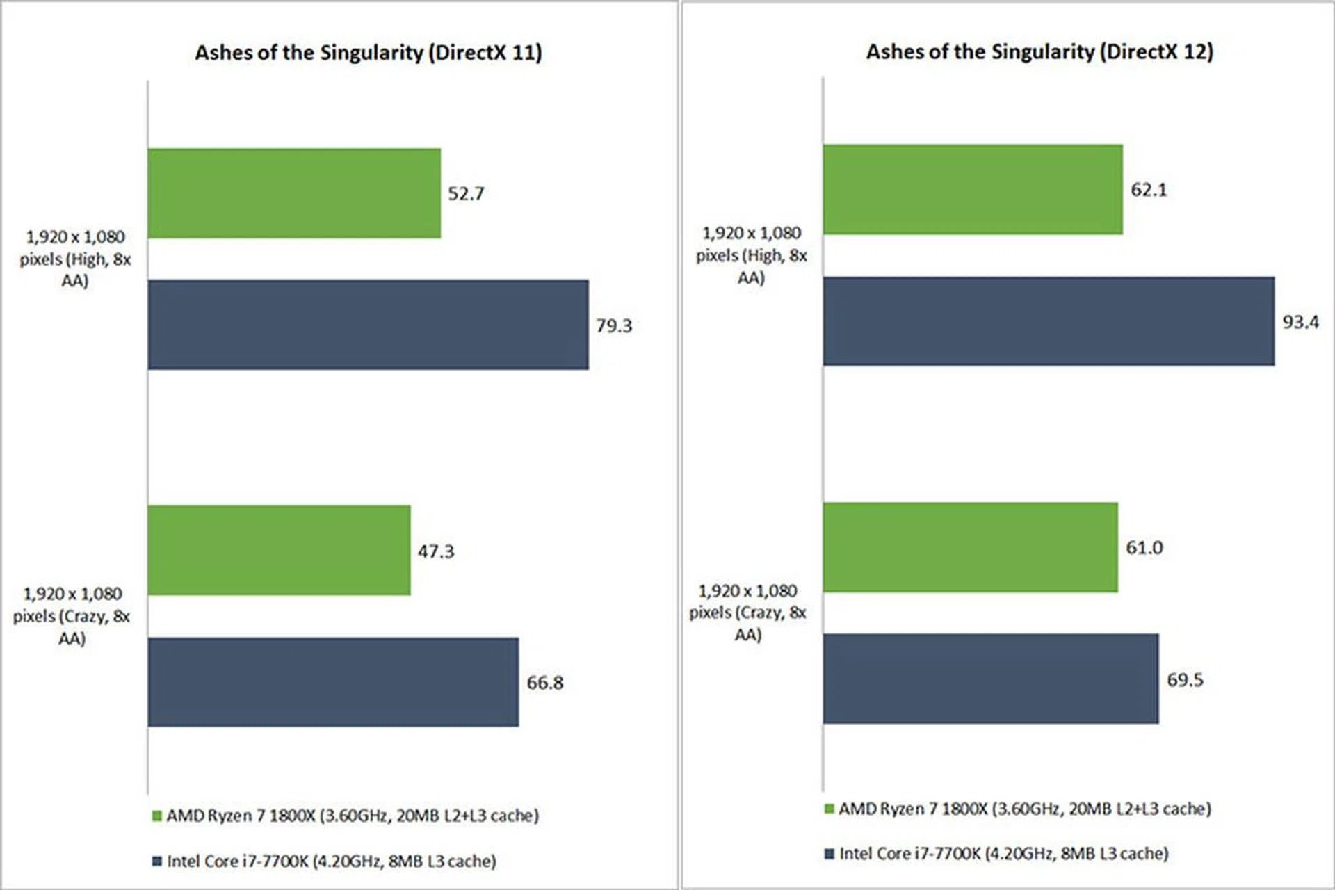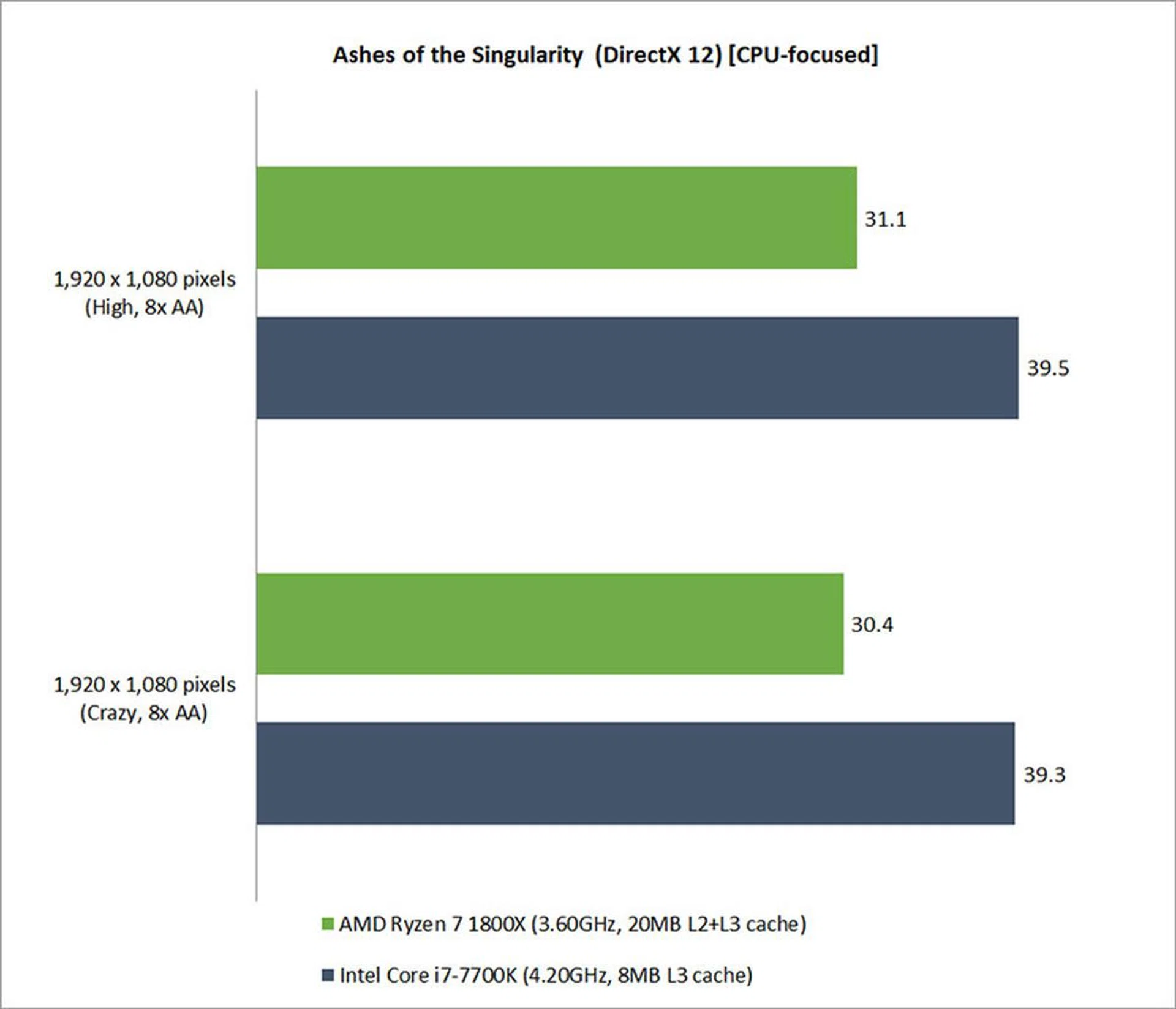 That said, we’ve been told that Oxide Games, the developer of Ashes of the Singularity, is working to scale its Nitrous game engine to take better advantage of the full 8-core/16-thread architecture on Ryzen, so you might possibly expect better numbers in the future. As seen in the CPU-focused benchmark below, the higher clock speeds of the Core i7-7700K still helped it beat the Ryzen CPU.