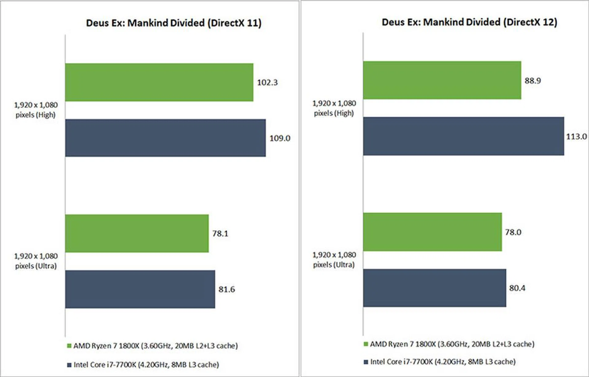 Deus Ex: Mankind Divided is one of the most demanding games out there right now, and the Ryzen 7 came up close behind the Core i7-7700K. However, oddly enough for us, performance consistently dropped in DirectX 12 mode.