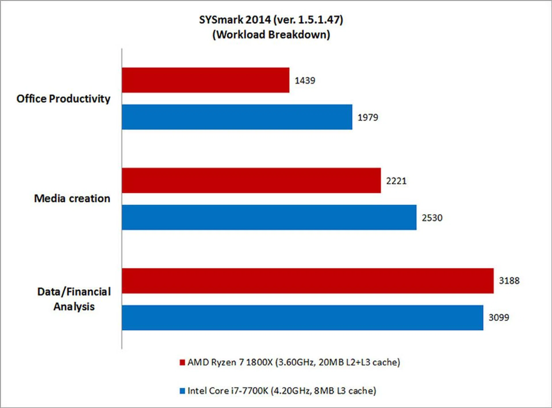 Sysmark 2014 test suites / Processor models | AMD Ryzen 7 1800X | Intel Core i7-7700K | Intel Core i7-6950X |