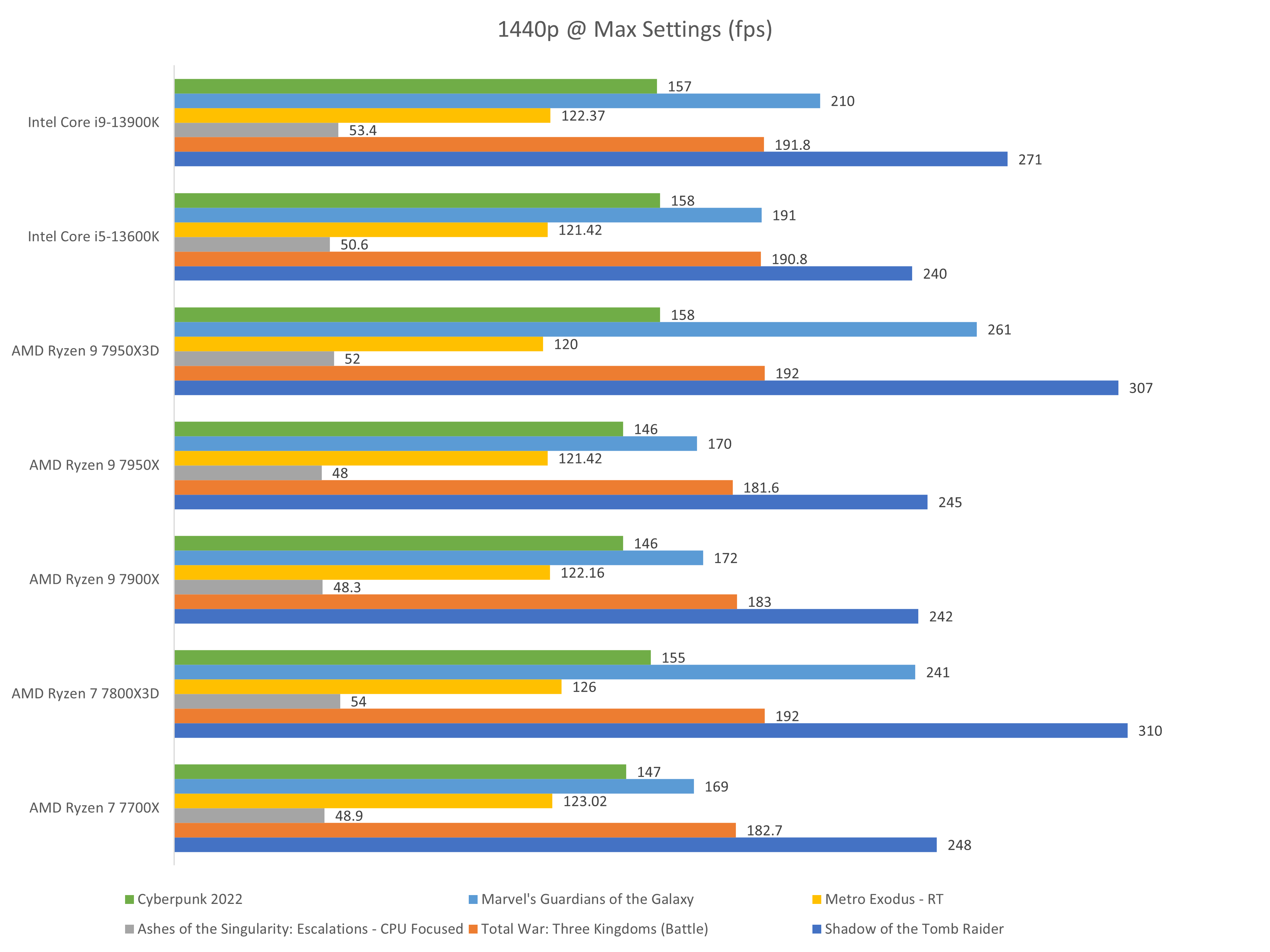I put the Ryzen 7 7800X3D through its paces using the ROG Crosshair X670E Hero motherboard, 32GB of Kingston Fury DDR5 RAM, and an NVIDIA GeForce RTX 4090 Founders Edition. In most of the games I tested at 1080p with maximum settings, the 7800X3D outperformed Intel's flagship, the Core i9-13900K. It was particularly striking to see how the Ryzen 7 7800X3D and a GeForce RTX 4090 card achieved 354fps at 1080p in Shadow of the Tomb Raider, just a single digit behind the 7950X3D. Notable performance gains could also be seen with Marvel’s Guardians of the Galaxy and Metro Exodus and Ashes of the Singularity: Escalations, besting both the i9-13900K and 7950X3D.