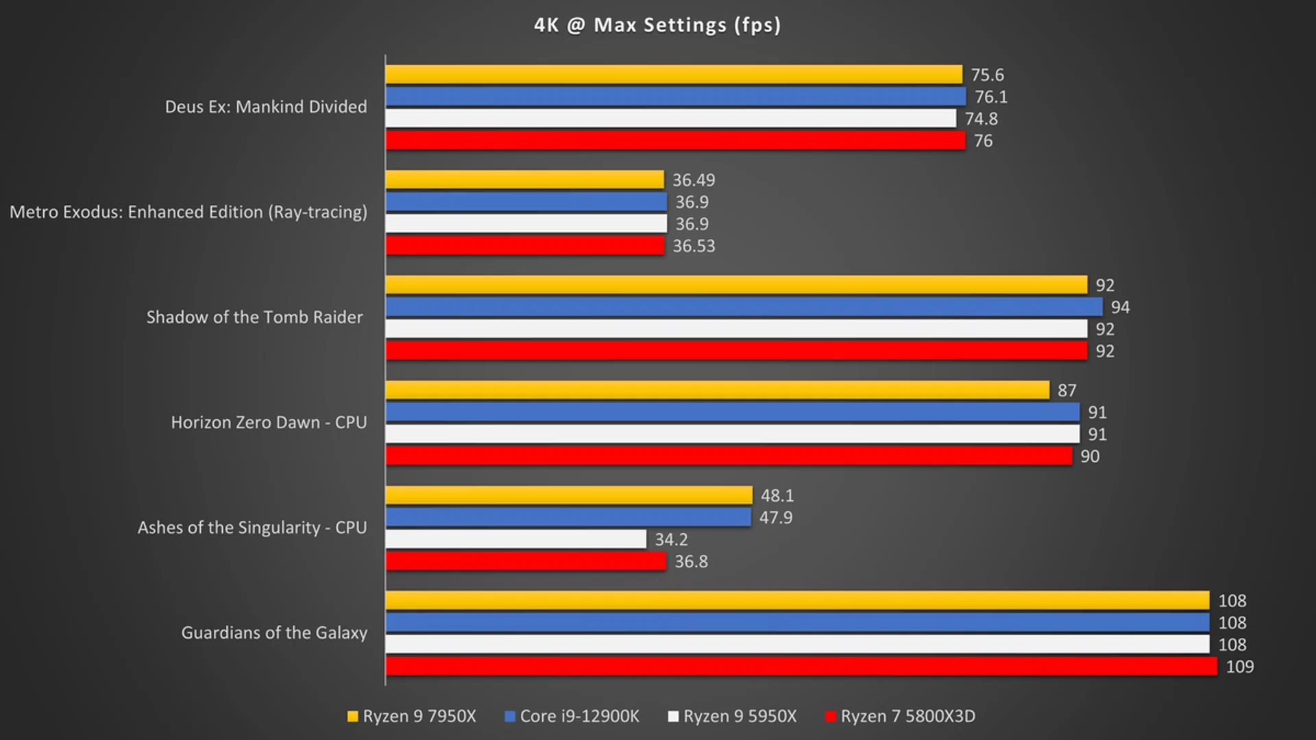For one, the Ryzen 9 7950X performance against Intel’s Core i9-12900K showed some mixed results: While it scored better in games like Horizon Zero Dawn and Metro: Exodus, it lost out in Ashes of the Singularity: Escalations and Marvel’s Guardians of the Galaxy. It could be that the Intel processor is just better optimised to use its more powerful P-core (with a boost clock speed up to 5.2GHz) in certain games, than the Ryzen 9 7950X is able to boost its own clock speed up to 5.7GHz in those same games.