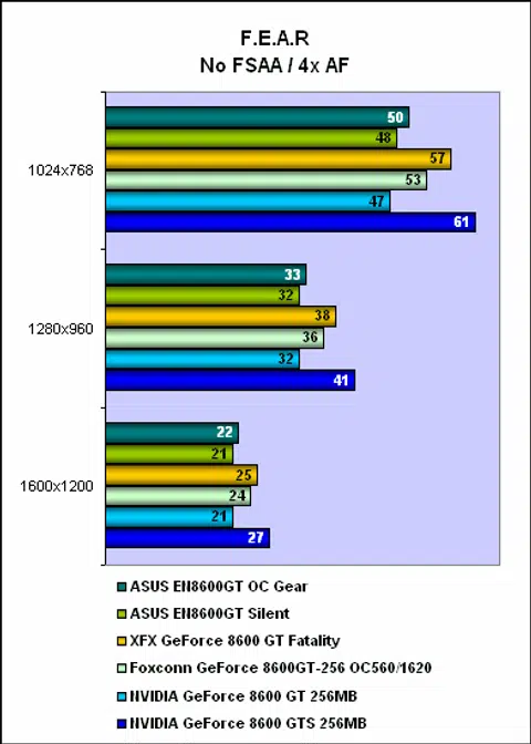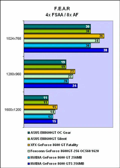 The ASUS EN8600GT OC Gear held a lead of just 1fps over the silent version and the reference card in F.E.A.R. With anti-aliasing however, this was no longer so and the reference card was the slightly stronger performer. Again, the different driver versions used may account for the minor discrepancy in scores, but in the overall scale of things, they're all performing similarly.