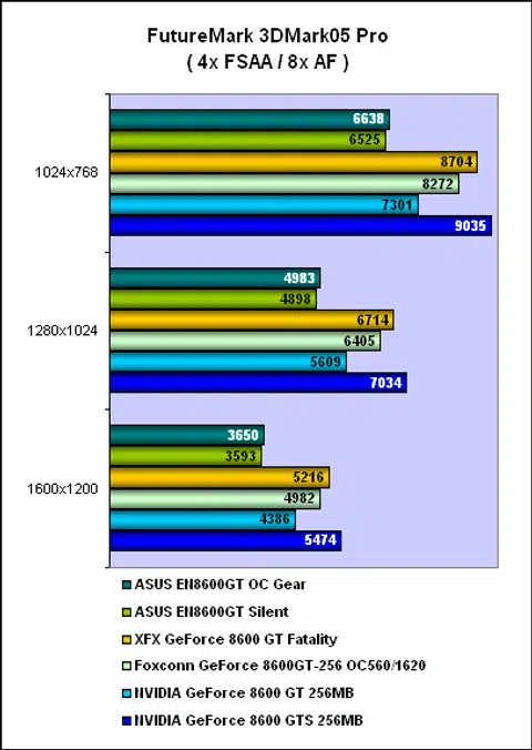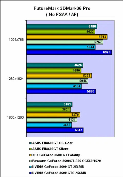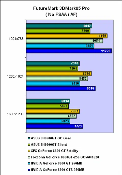 We have covered quite a few GeForce 8600 GT retail cards in the past, including overclocked ones like the XFX GeForce 8600 GT Fatal1ty and Foxconn GeForce 8600 GT. These cards will be compared against the ASUS EN8600GT OC Gear, together with a silent version from ASUS. These four cards will be running ForceWare 158.22 drivers. We also included a standard NVIDIA GeForce 8600 GT and 8600 GTS for reference and these are on ForceWare 158.16 drivers. The following benchmarks were tested: