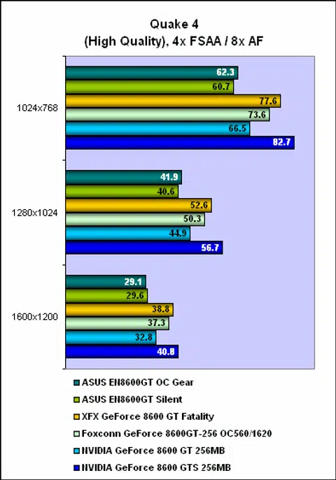 Quake 4 was another case where the two ASUS cards trailed the reference card. At least the ASUS EN8600GT OC Gear managed a slight lead over the silent version. We also encountered a strange problem in the game during our timed demos. The OC Gear kept freezing during the demo at the exact same point and despite our attempts to reinstall both the OC Gear drivers and its related utilities (SmartDoc and GamerOSD), it refused to complete the benchmark. Only after we had completely uninstalled all drivers and applications required by OC Gear - essentially testing the card based solely on its hardware - did the problem vanish and we could finish our benchmarking. We speculate that the OC Gear module and applications could in some way be interfering with the game but based on only one example, it's not conclusive. Meanwhile, ASUS' engineers are trying to replicate this 'bug' in its labs and we'll update this section if there is outcome to this issue. So far from their current findings, it seems more like an isolated issue.