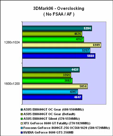Here, we found the ASUS OC Gear card scoring slightly better (up to 2%) than the silent ASUS GeForce 8600 GT and the reference card on most occasions, which meant it performed to our expectations. The actual in-game difference was rather indistinguishable and users would be hard pressed to identify the cards.
