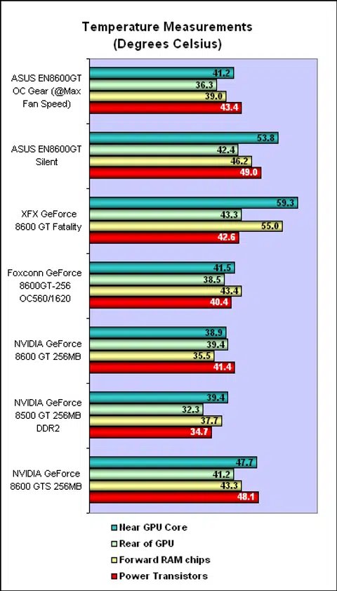 With the fan on the OC Gear adjusted for maximum, the temperatures we recorded on the card were comfortably cool and competitive with the other GeForce 8600 GT cards. Even at its maximum speed, the noise level did not alter much and we couldn't really tell with our ears that the fan was at its fastest. ASUS seems to have attached a rather efficient cooler to this card and the fact that the fan speed is adjustable is another bonus; though we doubt you would need to adjust it anyway since it's relatively quiet regardless of the fan speed.