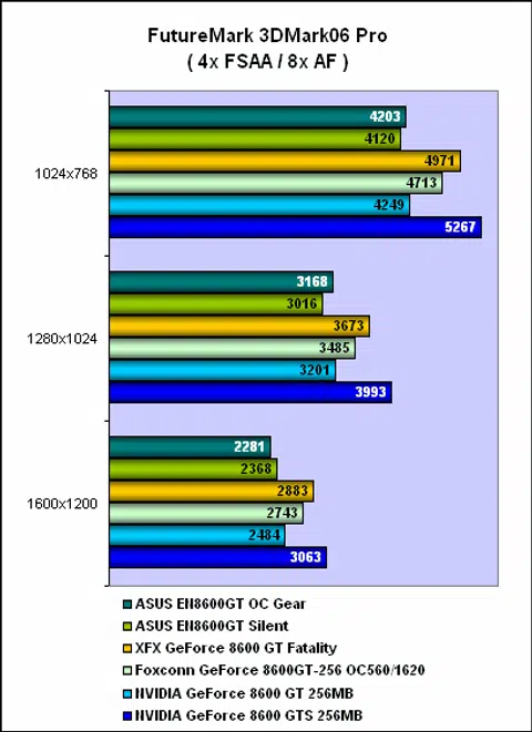 Despite the higher stream processor clock, the ASUS EN8600GT OC Gear ended up slower than the reference GeForce 8600 GT, though it was marginally faster than the ASUS EN8600GT Silent. This difference was quite significant especially with anti-aliasing enabled in 3DMark05. However, the fact that both were using slightly different driver sets could be a reason for such results. This is borne out with the scores in 3DMark06, where the ASUS OC Gear was slightly ahead of the reference card. Naturally, the overclocked cards were ahead of both the silent and OC Gear ASUS cards.