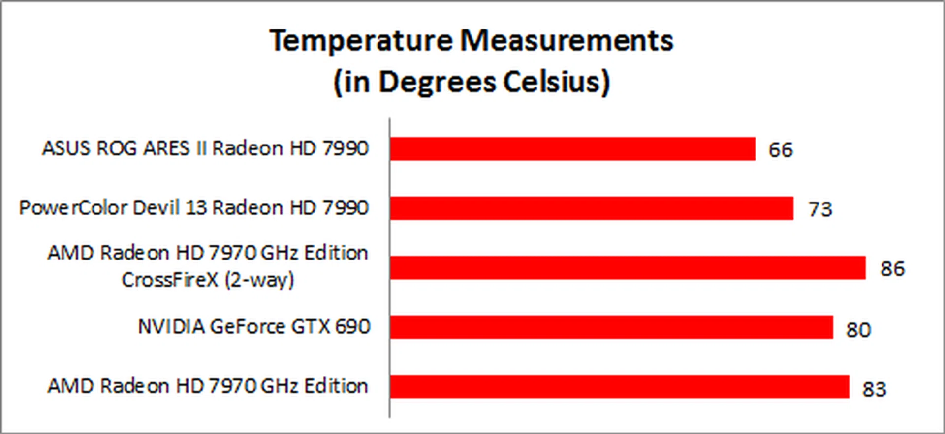 The ARES II's hybrid liquid/air cooling system is one of its big draws and it certainly proved itself an effective cooling system, scoring a full 20 degrees cooler than our Radeon HD 7970 CrossFireX setup and 7 degrees cooler than the triple-fan Devil 13. And of course since the card is mostly liquid cooled, operational noise is hardly anything to be concerned about.