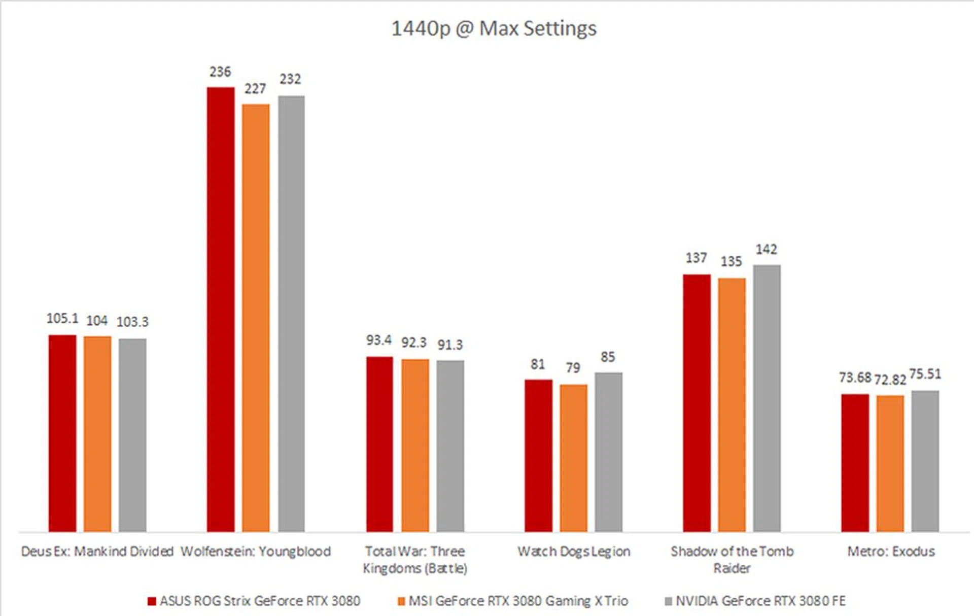 The GeForce RTX 3080 is more than capable of taking on the 1440p resolution at maximum settings. The ASUS ROG Strix GeForce RTX 3080 sailed through all the tests, coming in faster than the MSI card by a few frames in most of the games tested. However, once again these differences are barely worth mentioning, and you'll probably end up paying more attention to things like cooling performance, noise, and aesthetics.