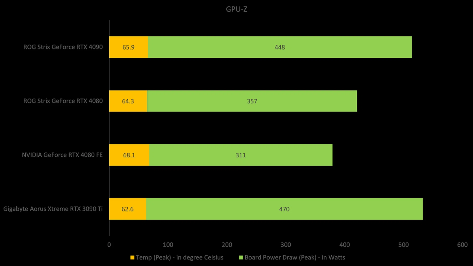 Cooling performance is what really matters when it comes to a comparison between these two cards. With its upgraded cooler that simply dwarfs everything else, ASUS' RTX 4080 card was able to shave nearly 4°C off the Founders Edition card's peak operating temperature.