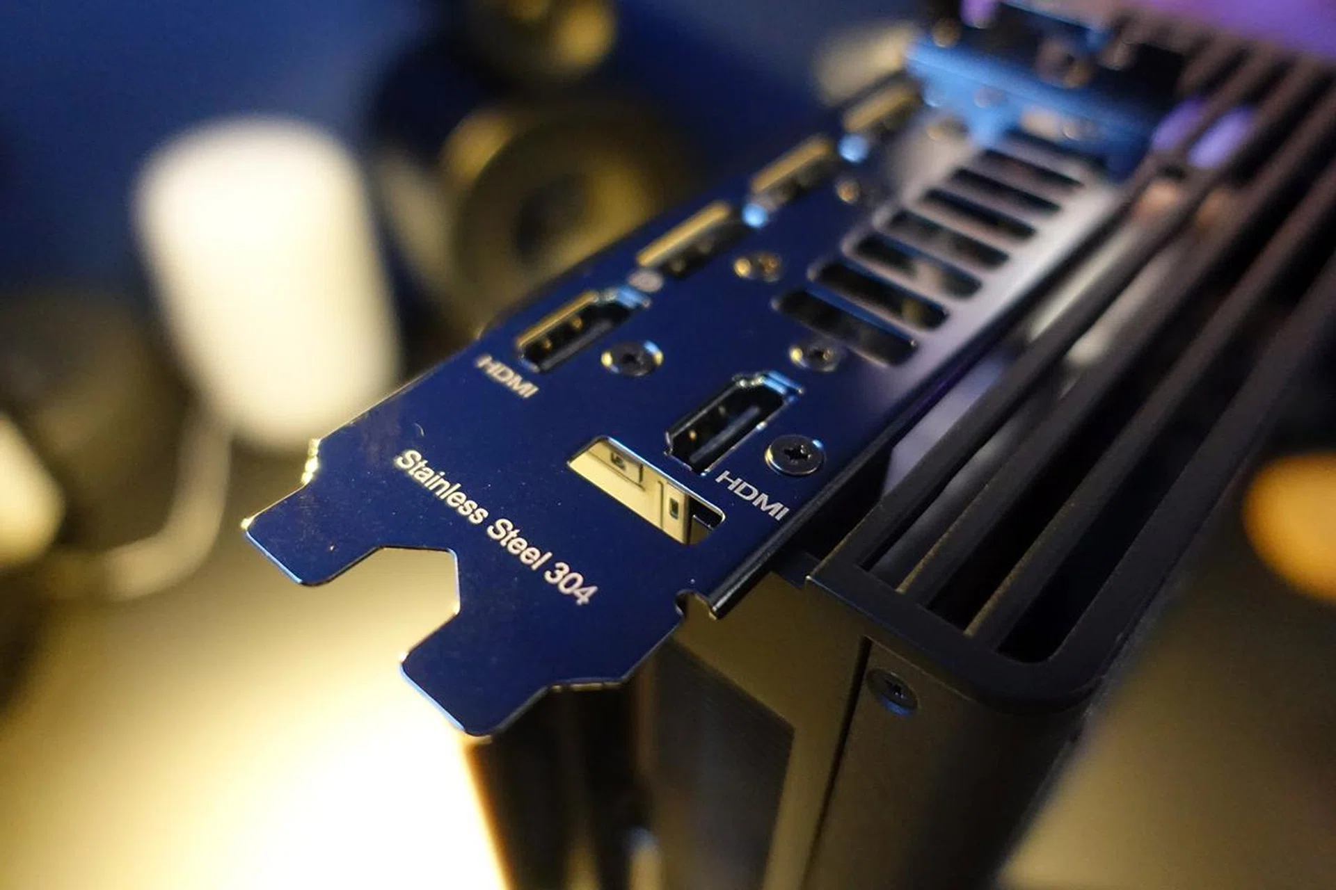 The Strix RTX 4080 includes two HDMI 2.1 and three DisplayPort 1.4 display connectors, but you can only output to four displays at any one time. Unsurprisingly, it also uses the NVIDIA-mandated 16-pin power connector.