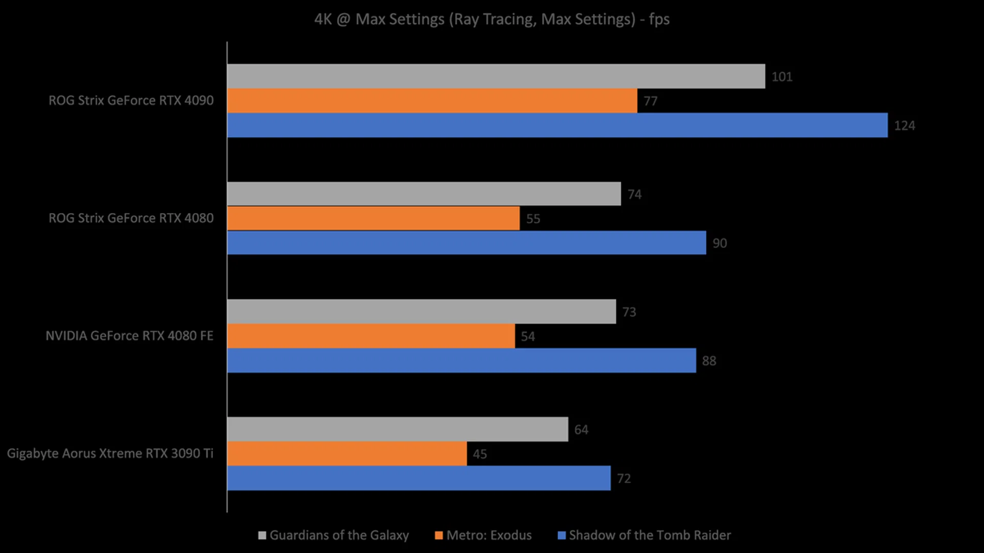 With ray tracing turned on, performance unsurprisingly takes a hit. However, the ASUS card still maintains a slight lead over the Founders Edition of the RTX 4080.