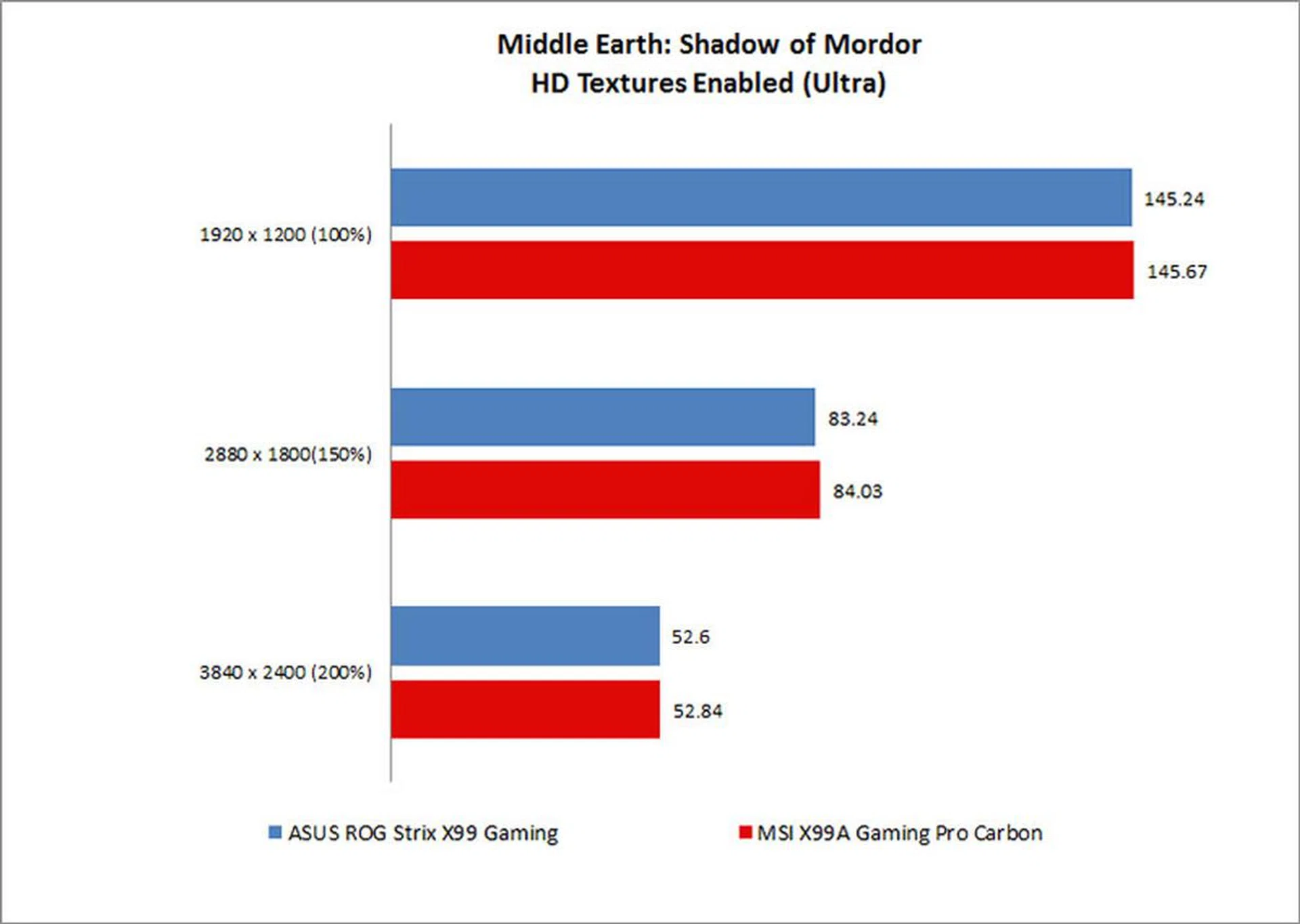 Finally, we ran Middle-earth: Shadow of Mordor to get an idea of gaming performance. As per the graph, the differences were minuscule as expected, with both the ASUS and MSI boards coming within a single frame of each other at all the tested resolutions.