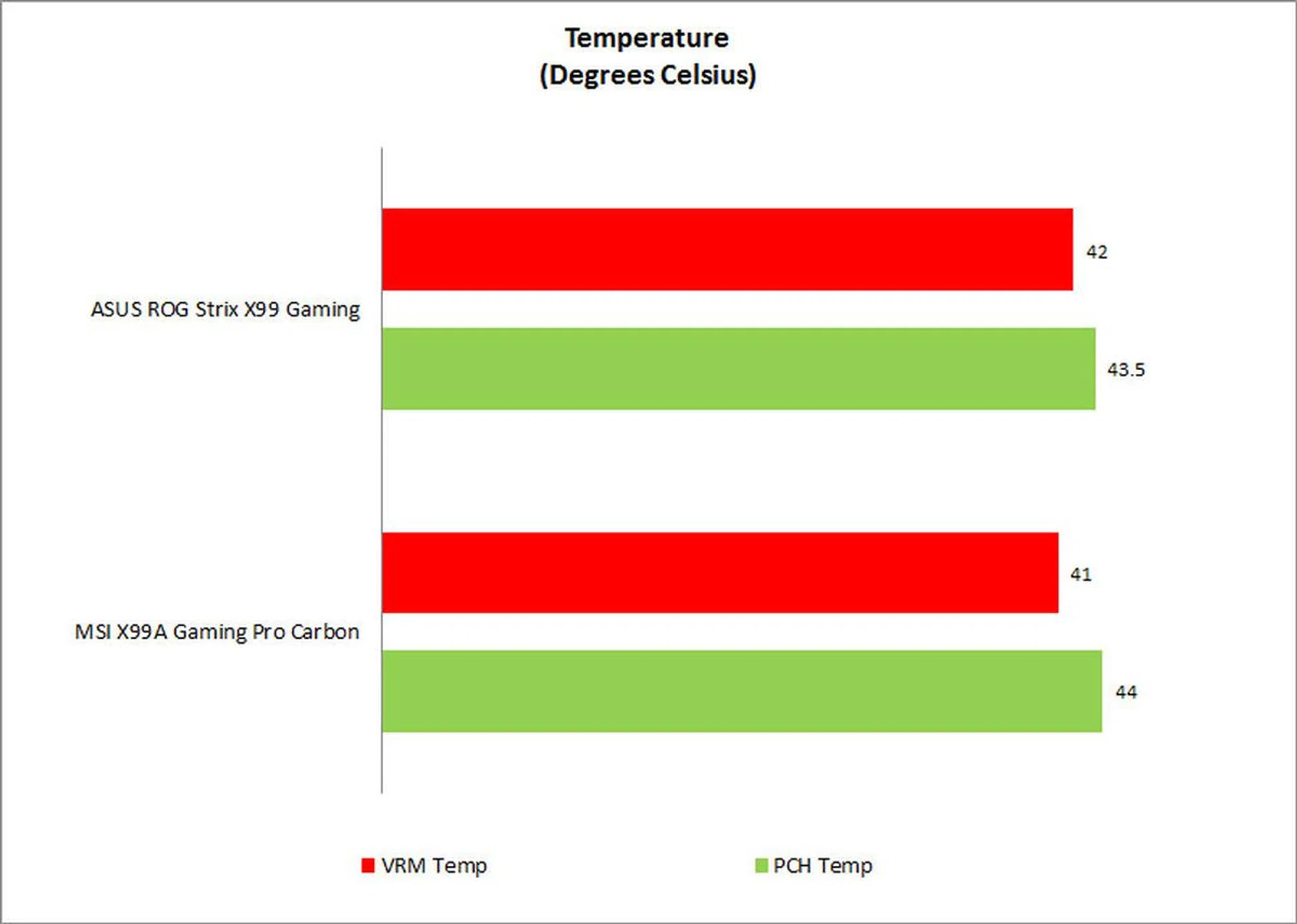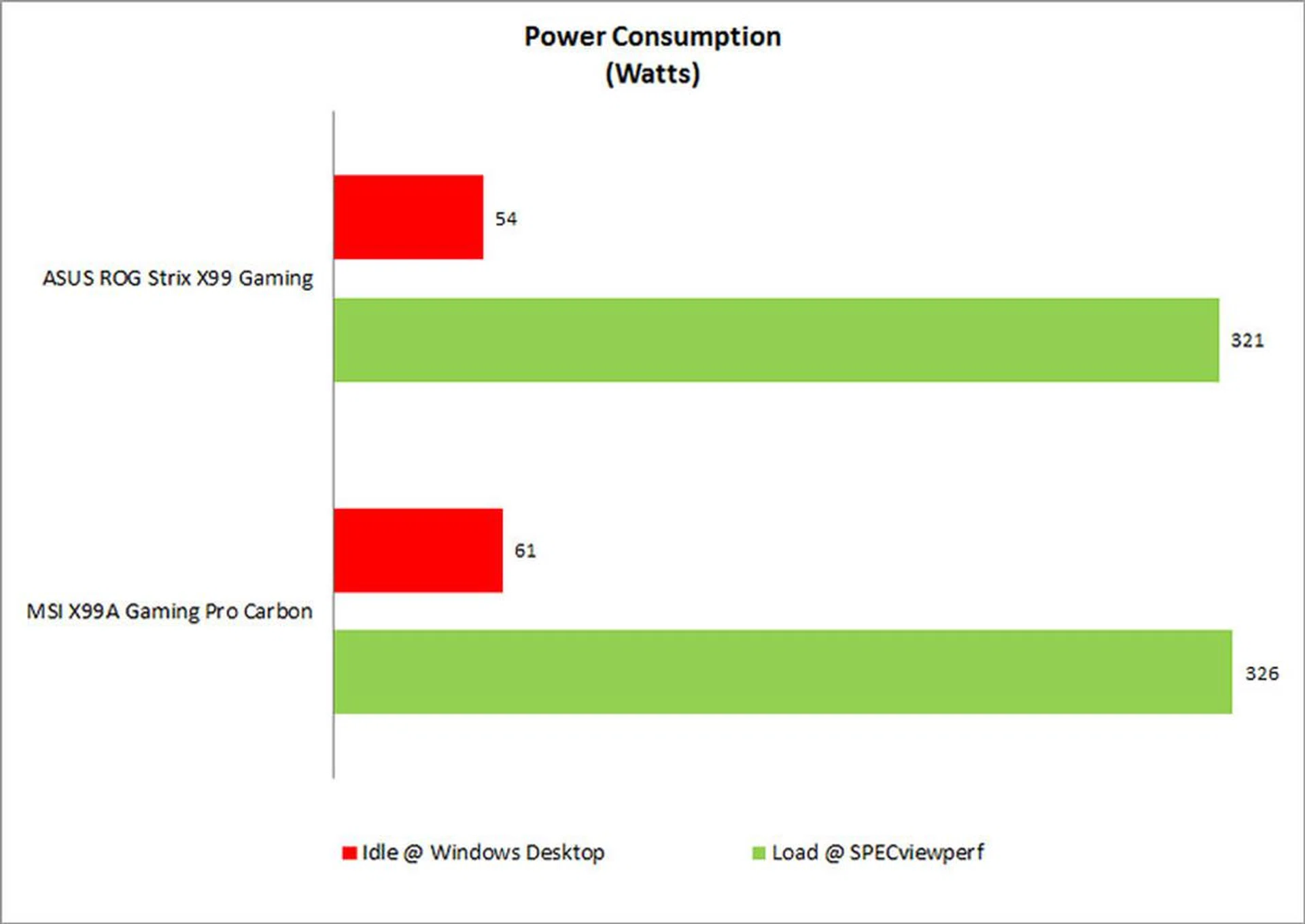 The ASUS ROG Strix X99 Gaming had a lower idle and peak power consumption than the MSI motherboard. It’s still not a significant amount, but it’s a small point in ASUS’ favor.
