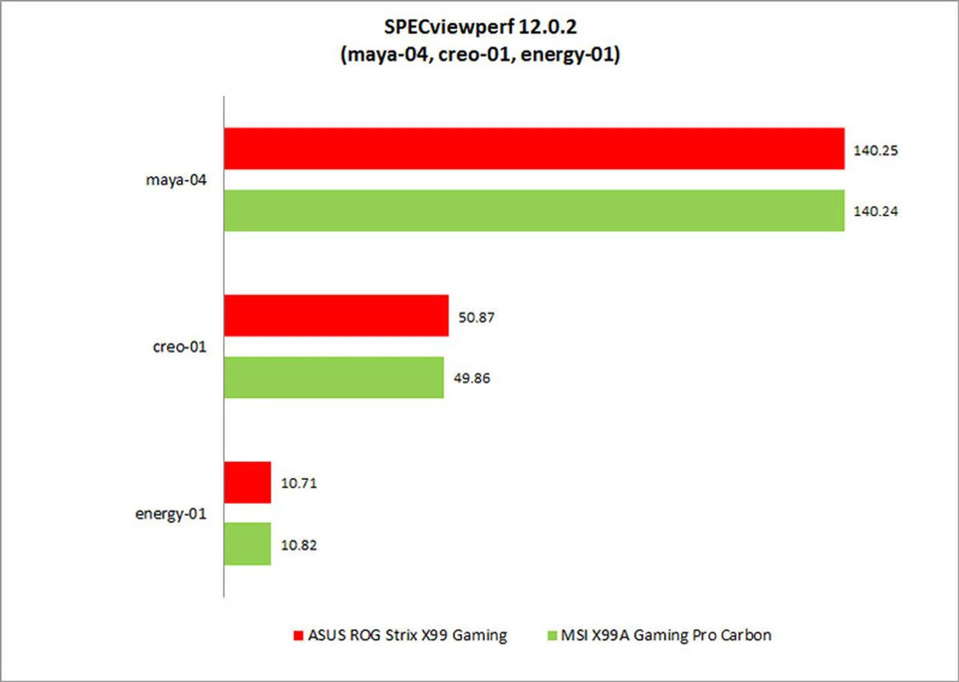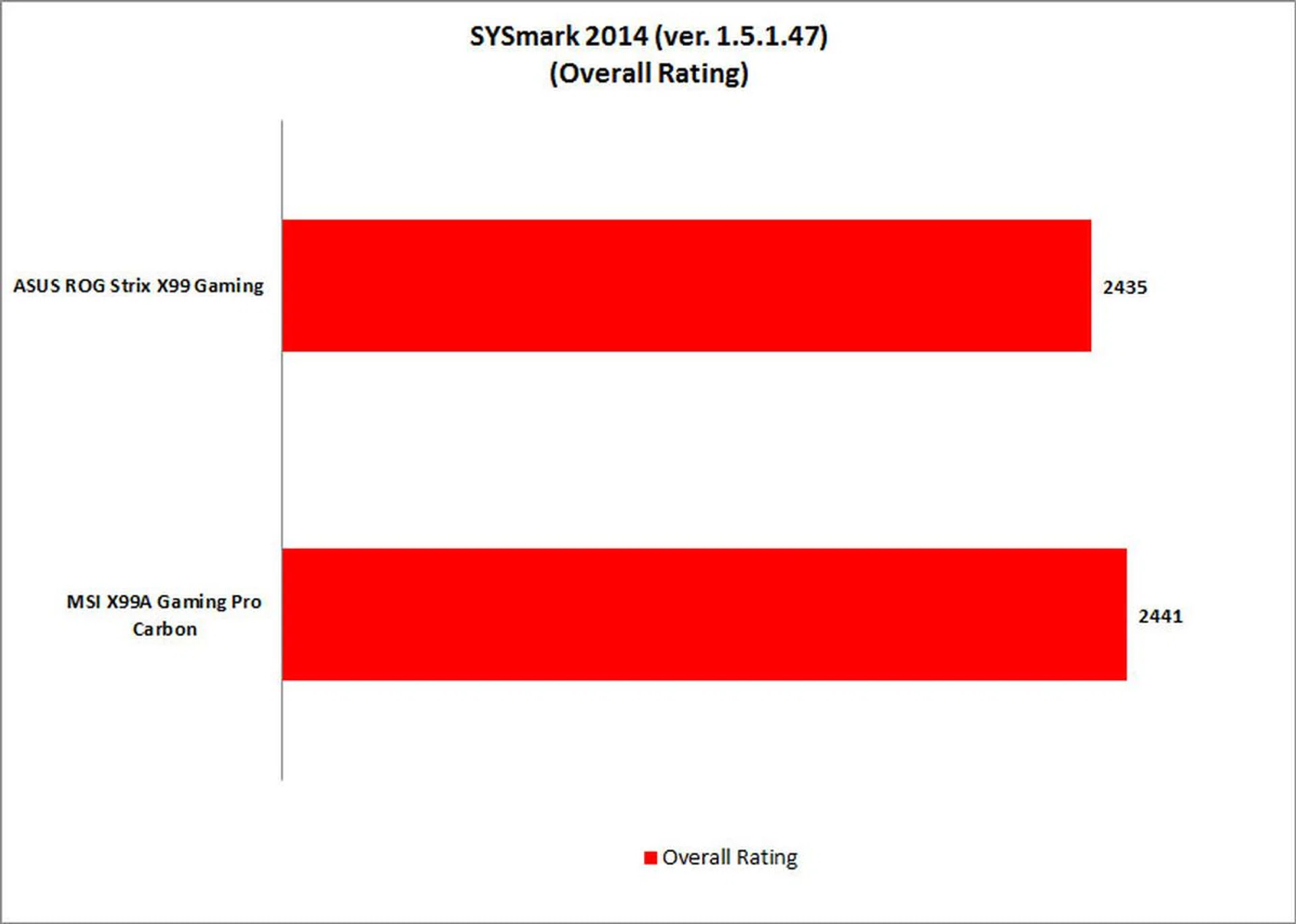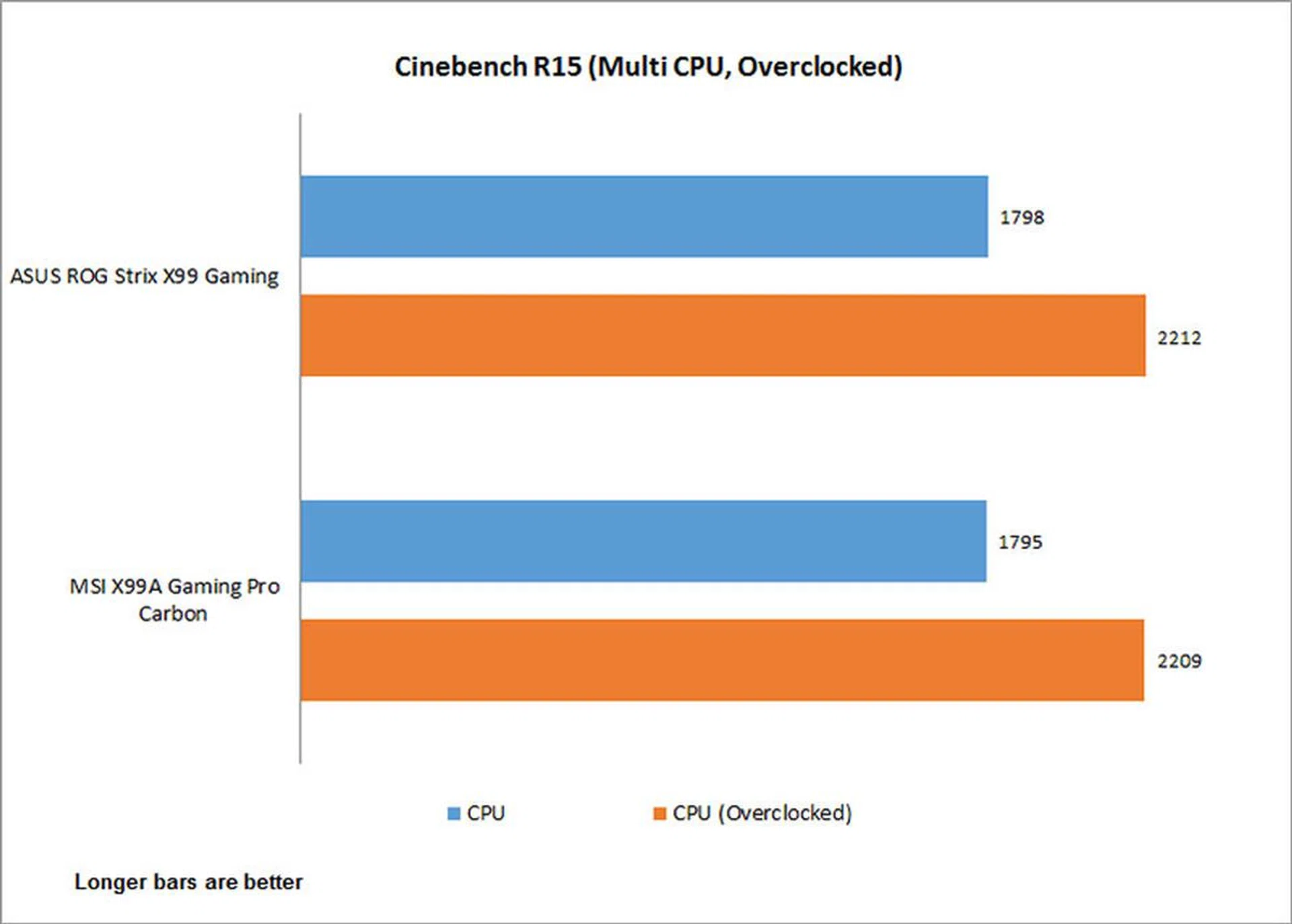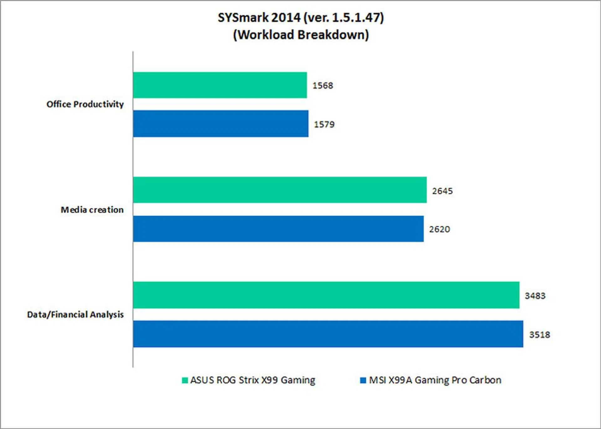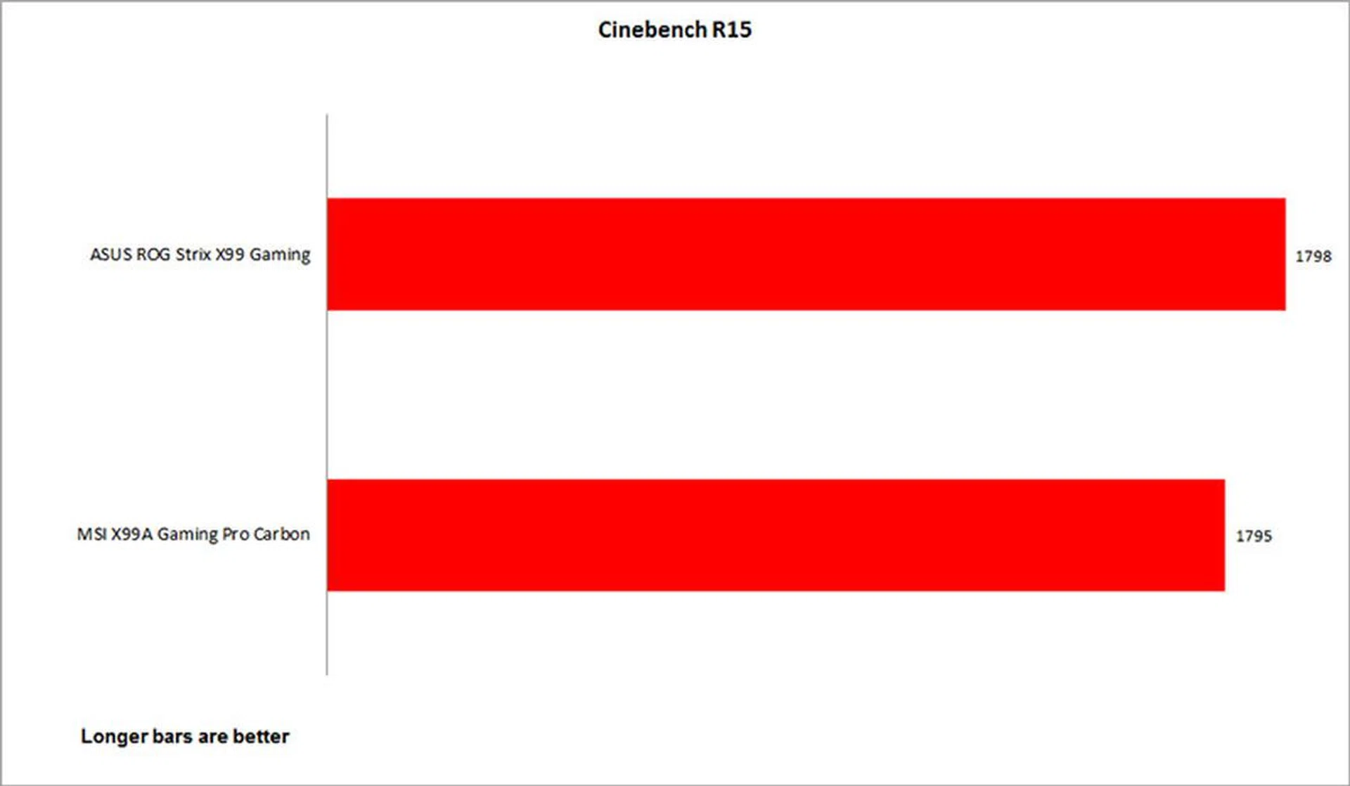 We don’t have many Intel X99 motherboards to compare the board with, especially since we've chosen to use the new 10-core CPU, so we’ve settled with figures from one of MSI’s latest boards, the X99A Gaming Pro Carbon, to provide a point of reference for the ROG Strix X99 Gaming’s performance.