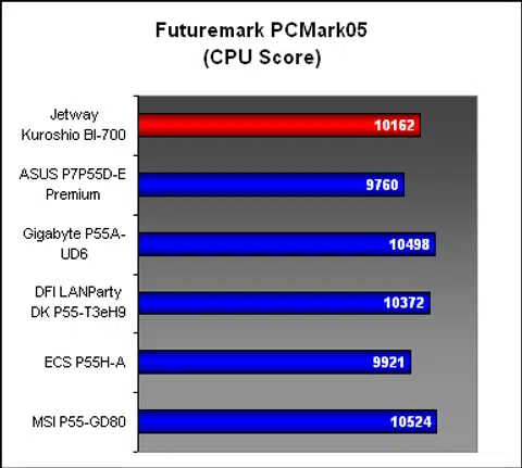 There was quite a bit of variation in scores for PCMark05 but the Jetway Kuroshio was able to keep up relatively well. Its overall score was in the top three and looking at the individual breakdown, it was not hard to see why. The Jetway never looked like dropping into the bottom spot and managed to stay with its competitors.