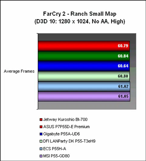 When it came to the gaming numbers, it has been difficult trying to distinguish between these P55 motherboards and the Jetway joins the tight group with scores that are separately by the merest of margins. At least you'll know that you can practically close your eyes and pick any P55 board if gaming is your sole consideration.