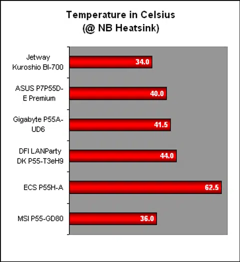 A surprise result was the temperature reading for the Kuroshio. While this Jetway board came with heat-pipes, we weren't expecting it to beat some of the more established brands. However it appeared to be the case, with the MSI closest to the Jetway in this section. At 34 degrees Celsius, it's hard to beat the Jetway. Perhaps another contributing factor is the board's low component count as it's a board with a very simple design.