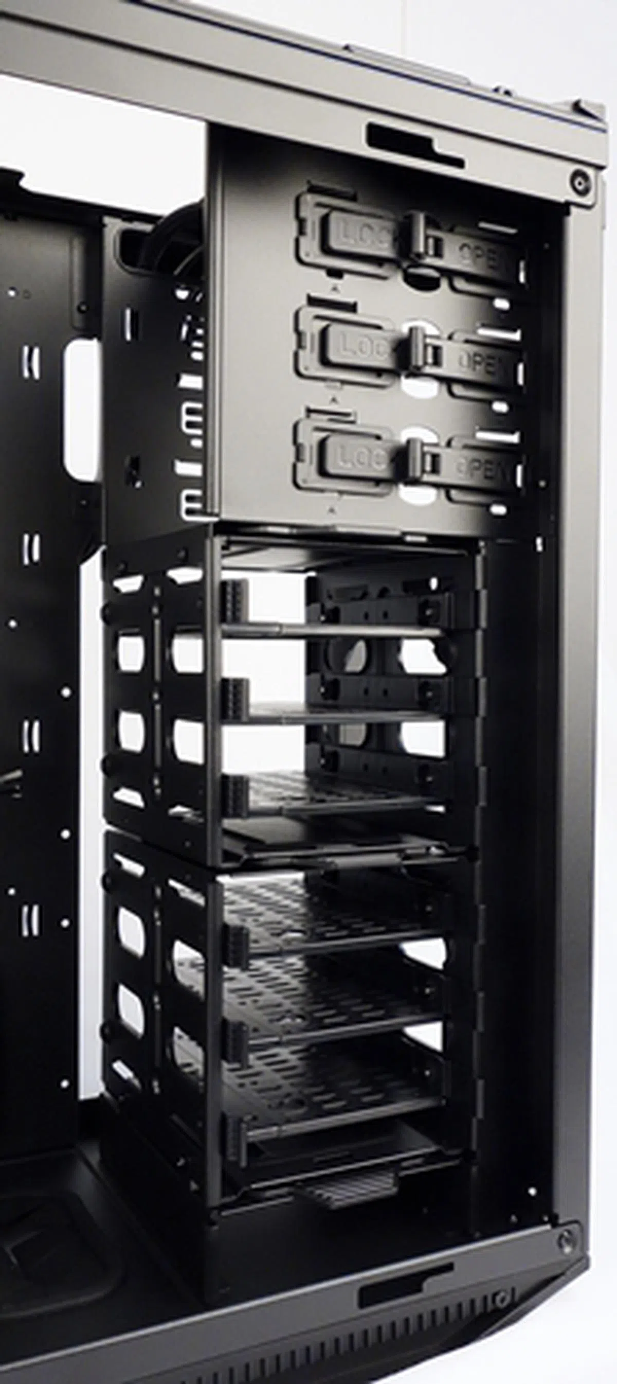 The side panels of the HAF 915 case has thumbscrews that are all attached to the panels and helps prevent the loss of any of these screws. After removing the side panels, we see the spacious interior of the case. If you plan on setting up a Mini-ITX system, it is able to accommodate graphics cards that are as long as 14.17 inches (360mm). You can rest assure that this should fit almost any mainstream or enthusiast graphics card. In front, it has a removable 2.5-/3.5-inch drive enclosure, and it is able to fit up to three such drives. Above it, there is a 5.25-inch drive bay that comes with a convenient locking mechanism.