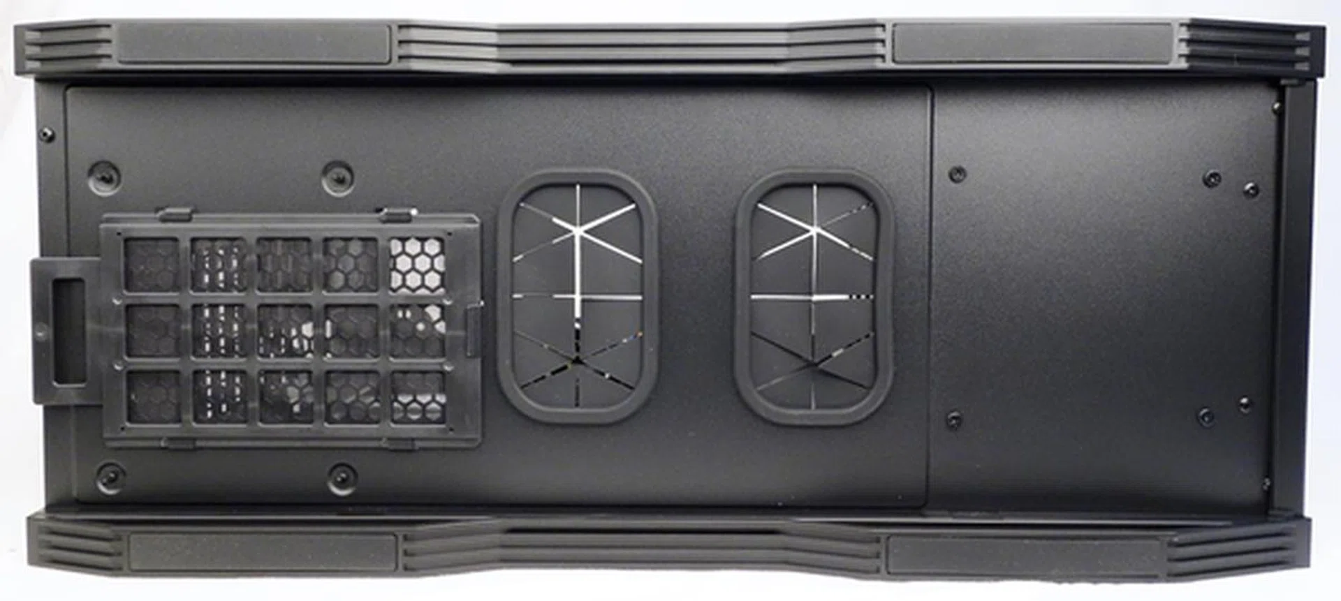 The bottom of the HAF 925 has a removable dust filter for its intake vents. The large rubber grommets cover openings that allow accessories to be extended from a bottom-mounted HAF 915 chassis. The feet of the mid-tower HAF 925 have to be removed first, in order to expose its mounting rails, which are identical to the ones found at the top of the HAF 925.