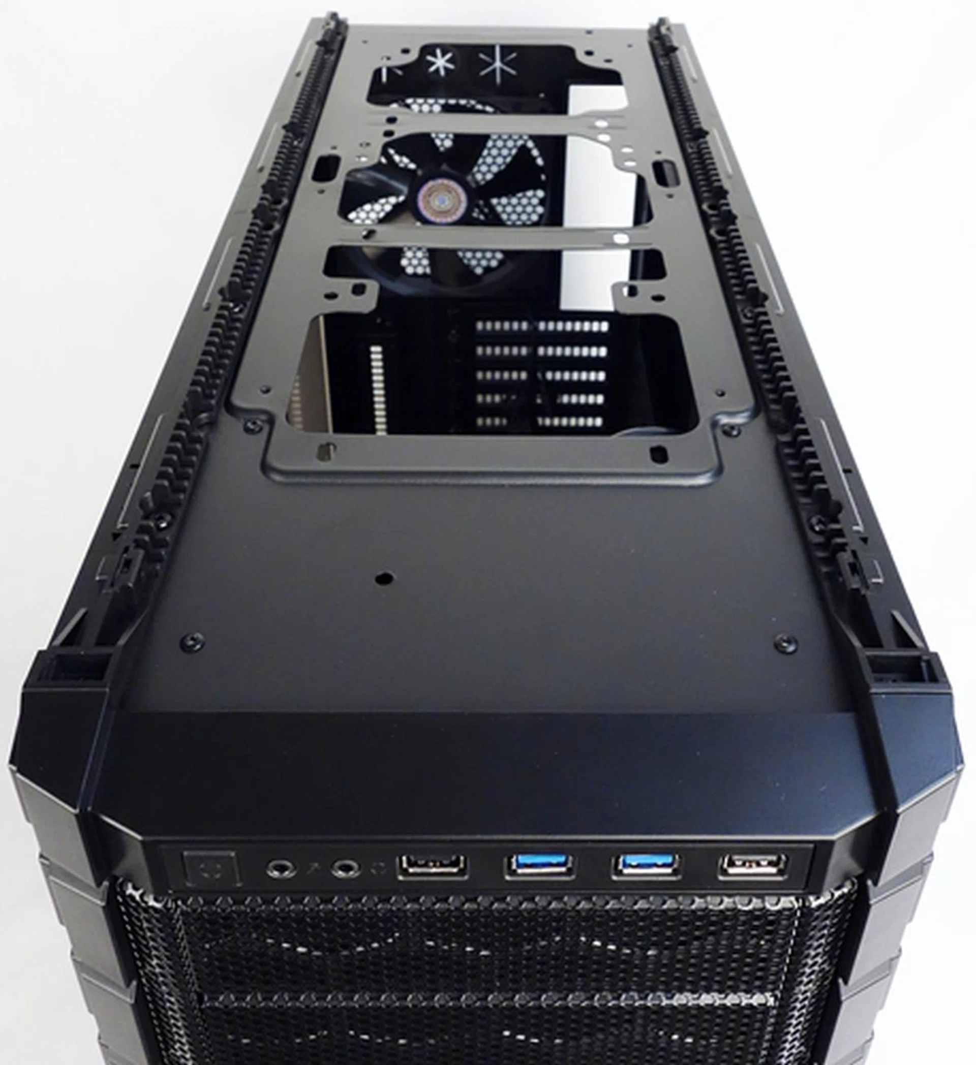 From this angle above the case, we can see the openings to mount a trio of 120mm outlet fans. Though there are three openings, the casing's official specifications state that it fits up to a pair of such fans.
