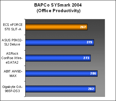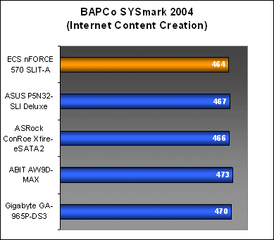 The NFORCE 570 SLIT-A, along with ASRock's ConRoe XFire-eSATA2 posted lower scores due to the reduced bandwidth of DDR2-667, which impacted the most in data analysis calculations done in the Office Productivity workloads. All the boards were on par in the more CPU intensive Internet Content Creation portion of the benchmark.