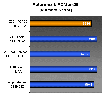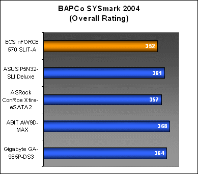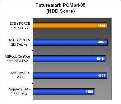 The NFORCE 570 SLIT-A was hampered again by poorer memory results running DDR2-667, while the ASUS P5N32-SLI Deluxe steamed ahead perfectly with DDR2-800. We also noticed the trend that among all the chipsets tested, CPU scores remain almost on par while the ECS board managed to return competitive HDD performance results.