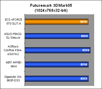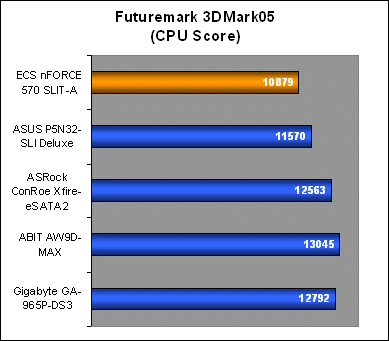As with most gaming benchmarks that are heavily GPU-centric, you will notice that all our boards performed on par with each other. However, both the nForce-based boards seem to perform poorly in 3DMark05's CPU-only tests compared to the Intel boards.