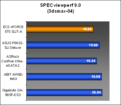 As our readers should well know by now, SPECviewperf is an OpenGL benchmark that stresses the memory subsystem as much as the graphics. As such, we've already expected that the NFORCE 570 SLIT-A and the ASRock ConRoe XFire-eSATA2 to show lowered scores. However, the ECS board came in last in almost every workload.