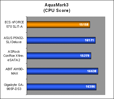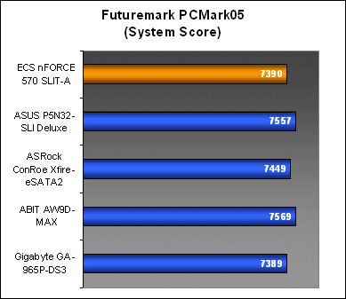 To benchmark the ECS NFORCE 570 SLIT-A motherboard, we'll be using a Core 2 ready ASUS P5N32-SLI Deluxe motherboard as a comparison. The P5N32-SLI Deluxe is based on the nForce 4 SLI X16 chipset, which should yield similar results to the C19XE on the ECS board. We'll also throw in a mix of Intel P965, 975X and 945P Express results to see where the various Core 2 ready chipsets stand in the larger scheme of things. These boards include the ABIT AW9D-MAX (Intel 975X), ASRock ConRoe XFire-eSATA2 (Intel 945P) and the always trusty Gigabyte GA-965P-DS3 (Intel P965).