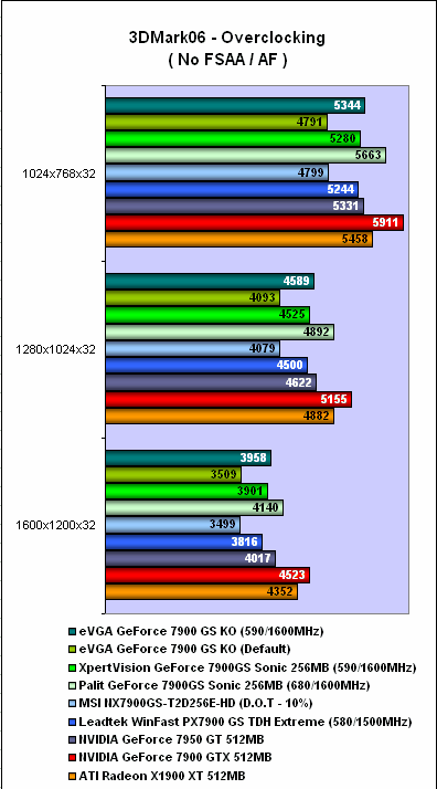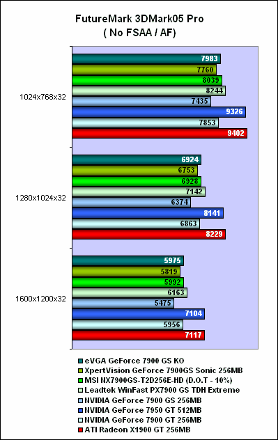 All the NVIDIA cards were using ForceWare 91.47 drivers while the sole ATI representative was on Catalyst 6.8. The clock speeds of the GeForce 7900 GS also differed as there were some overclocked editions, among them the ones from Leadtek (520/1400MHz), XpertVision (500/1400MHz) and of course, EVGA (500/1380MHz). Along with the reference version and other selected cards, these were all tested with the following benchmarks:
