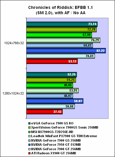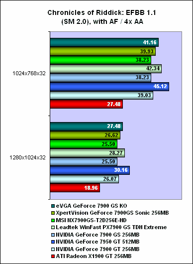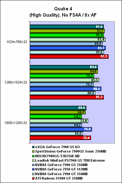 The EVGA continues to impress as it edged the XpertVision out to take the runner's up spot in these two OpenGL games. Again, the margins are hardly significant but they add to the trend of the EVGA consistently hitting above what its clock speeds suggest. That been said, we expect enthusiasts to be pleased by the performance of the EVGA so far. It may not be the fastest GeForce 7900 GS in the market but it does an excellent job for its specifications.