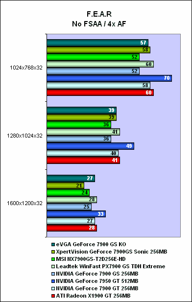 That slight edge from the EVGA over XpertVision in 3DMark was evident too in Splinter Cell, albeit probably too minor to be noticed in actual gameplay. Meanwhile, the Leadtek Extreme topped the table for GeForce 7900 GS cards in both games. However, the EVGA posed quite a challenge for the Leadtek in F.E.A.R, where it was only a frame or two behind. For this extremely taxing first person shooter, whether the cards are overclocked or not doesn't matter as much and for significantly better performance, we would recommend you get a more expensive graphics card than the GeForce 7900 GS.