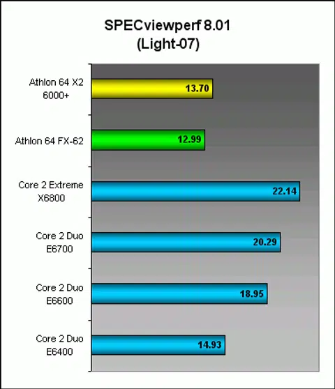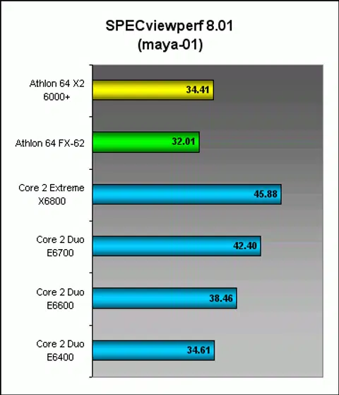 There are however, more memory dependent viewsets (which we've not shown here), and these actually showed that the Athlon 64 X2 6000+ fared only just as well as the FX-62 or a tad worse because of its inefficient utilization of DDR2-800 memory.
