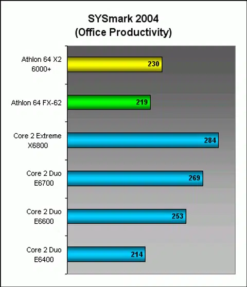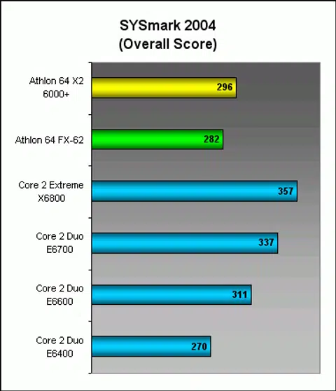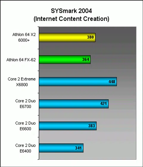 Firing up our real-world user-simulation benchmarking program, SYSmark 2004's overall scores are vital to understand the performance standings when dabbling in heavy office applications as well as multimedia creation activities. Right off from the start, the newcomer leverages on its higher clock speeds to post results that are 4.5% faster than the FX-62. However, this is still a far cry from the performance figures of the faster Core 2 Duo series. Even the Core 2 Duo E6600 has no problems copping against the Athlon 64 X2 6000+. Worst of all is that the E6600 is half the cost of an Athlon 64 X2 6000+. The nearest competitor in terms of price would be the Core 2 Duo E6700 (which is still a lot cheaper) and it too has at least a 10% lead over the newcomer.