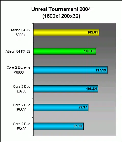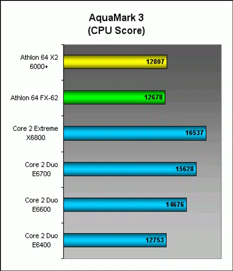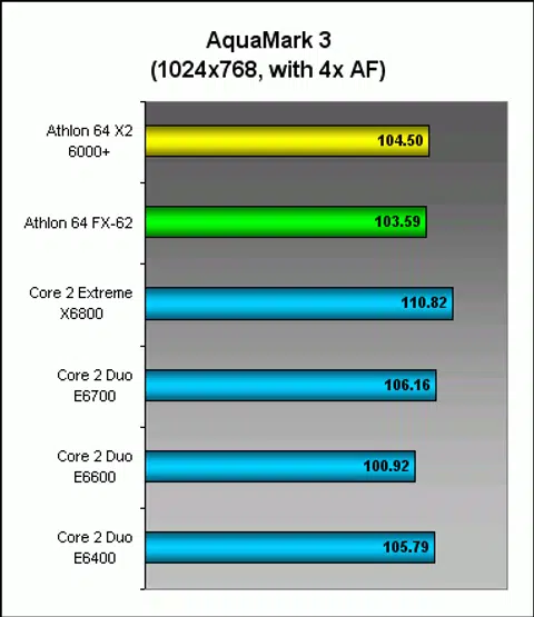Gaming used to AMD's forte and we can still see some remnants of that aspect peering through with the A64 X2 6000+ as it beat the Core 2 Duo E6700 in Unreal Tournament 2004 and managed a decent game performance standing in AquaMark 3 as well. However the CPU test segment of AquaMark 3 once again gave way to its weakness just like in 3DMark06.