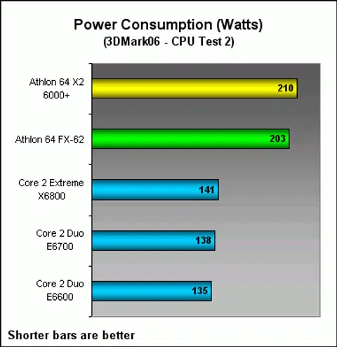 Even besides the usual price and performance comparisons that are convincing enough to steer one away from the Athlon 64 X2 6000+, the power consumption figures are also not in favor of the new linchpin from AMD. At idle, the differences are small, but if you often load your system for intense gaming sessions or lengthy processing tasks, watch out for your monthly power bill. And the reason is because the Athlon 64 X2 6000+ consumes 50% more power than Core 2 Duo processors when busy crunching away.
