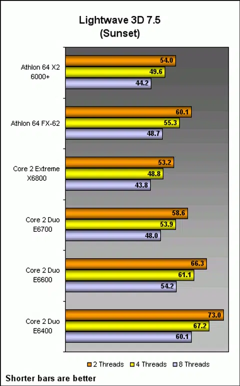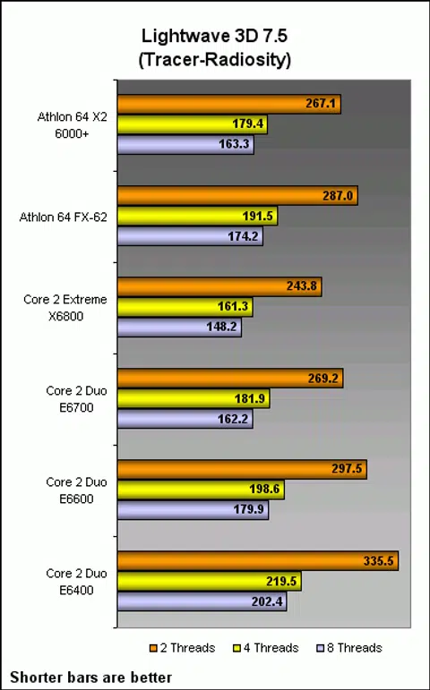 In this 3D modeling program's rendering simulation tests, the Athlon 64 X2 6000+ made better headway. In the more taxing Tracer-Radiosity render set, AMD's new star almost matched the performance of a Core 2 Duo E6700, while in the easer Sunset render set, it went up against even an a Core 2 Extreme X6800. Finally, the Athlon 64 X2 6000+ is showing some sparks of competition, but can it keep in more tests to come? Read on.