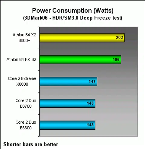 What about power consumption during gaming? Well, we have that covered with 3DMark06 too. This was again our choice after trying several games like F.E.A.R., Quake 4 and others which seemed to tax the system on a similar level as the 3DMark06 game tests. The Deep Freeze test in 3DMark06 seemed to have more impact and thus we stuck with it. Again the Core 2 processors had more than 40% power savings advantage and another clean sweep for the blue team.